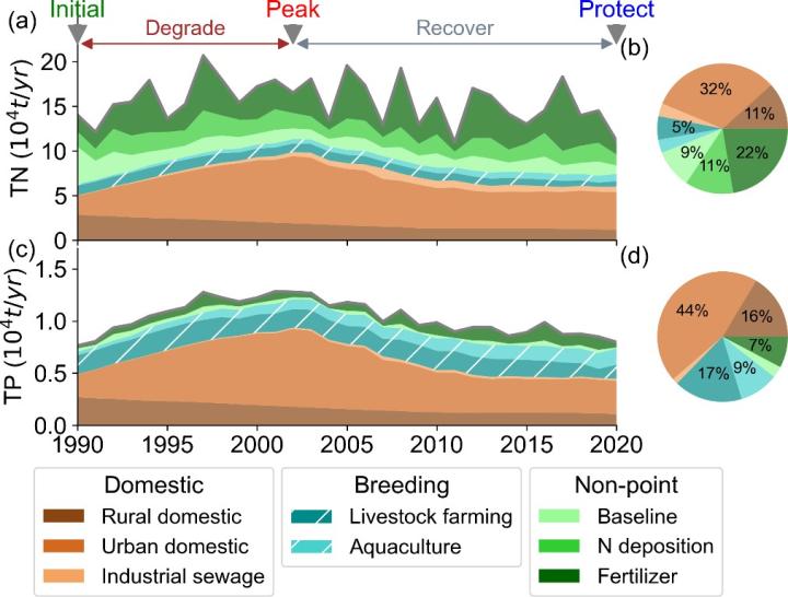 This study elucidates the dynamics of riverine nutrient fluxes and their pathways within a coupled human-hydrological-biogeochemical framework by examining a typical urban agglomeration during a period of rapid socioeconomic development. The following conclusions can be drawn from the analysis: